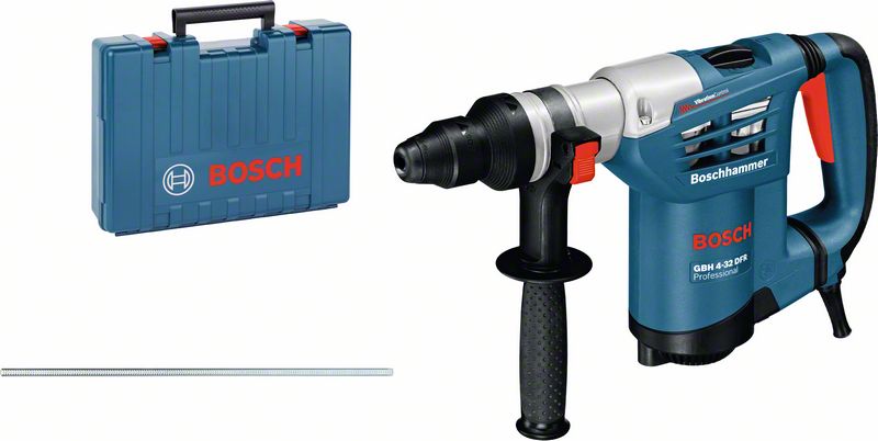 Vrtací kladivo s SDS plus GBH 4-32 DFR, GBH 4-32 DFR Professional je nejvýkonnější nářadí v kategorii síťových vrtacích kladiv SDS plus od firmy Bosch. Jeho 900W motor zajišťuje mimořádnou příklepovou energii 4,2 J pro nejrychlejší úběr materiálu při sekání v řadě SDS plus od firmy Bosch. Vrtací kladivo se pyšní odolnou konstrukcí a robustním kovovým krytem převodovky. Jeho funkce Vibration Control umožňuje snadnou nepřetržitou práci při úlohách náročných na čas. Toto nářadí je určeno na vrtání a sekání do betonu, zdiva, dřeva a kovu. Je kompatibilní s různými nástavci na odsávání prachu. Přídavná rukojeť ( 2 602 025 176); Hloubkový doraz 310 mm (1 613 001 003); Výměnné sklíčidlo SDS plus (2 608 572 213); Utěrka na nářadí; Tuba s mazacím tukem (číslo náhradního dílu 1 615 430 010); Příruční kufr (2 605 438 651)