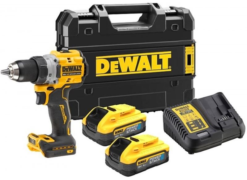 DCD800 je náš nejnovější a nejvýkonnější bezuhlíkový dvourychlostní vrtací šroubovák, který poskytuje až 90 Nm točivého momentu v kompaktním 164mm těle, navrženém tak, aby vám poskytl ten nejlepší výkon na těch nejnáročnějších stavbách. 2 rychlosti a 15 nastavení točivého momentu vám dávají maximální kontrolu nad vašimi vrtacími a šroubovacími aplikacemi. Vylepšená otočná LED dioda umístěná na patce vrtačky nabízí lepší viditelnost v tmavých a stísněných prostorách.\nBaterie POWERSTACK 5AH poskytují o 50 % více energie* s 50 % více práce na jedno nabití** a dvojnásobnou životností*** oproti standardním 5AH bateriím.