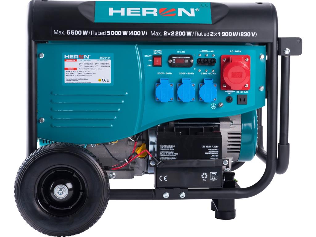 HERON elektrocentrála benzínová 13HP/5,5kW/6,8kVA (400V), 2x2,2kW (230V), elektrický start, podvozek, 8896414
