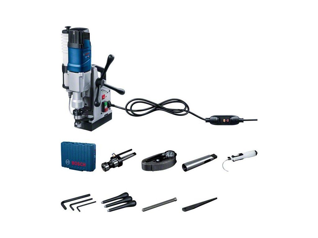 Magnetická jádrová vrtačka GBM 50-2, Síťová magnetická korunková vrtačka do kovu Bosch GBM 50-2 je praktická, odolná, mimořádně účinná a bezpečná. Díky nejlepšímu poměru ceny a výkonu ve třídě je toto nářadí ideální na náročné korunkové vrtání do kovu, vrtání spirálovými vrtáky a řezání závitů do kovu. Jeho laserová technologie umožňuje rychlé zaměření cíle a systém pro přerušení napájení poskytuje ochranu před úrazem elektrickým proudem. Systém Smart HMI umožňuje jednoduchý servis a kontrolu opotřebení uhlíků, což zabraňuje nečekanému přerušení práce. Dlouhou životnost nářadí zajišťuje indikátor přetížení, který zabraňuje přehřívání. Aktivace magnetického pole s velkou magnetickou silou usnadňuje přesné vrtání. Adaptér na jádrový vrták (číslo náhradního dílu 1 619 PB3 771); Klíč na vnitřní šestihrany 3 mm (číslo náhradního dílu 1 619 PB3 772); Klíč na vnitřní šestihrany 4 mm (číslo náhradního dílu 1 619 PB3 773); Klíč na vnitřní šestihrany 6 mm (číslo náhradního dílu 1 619 PB3 774); Vyrážeč vrtáků MT2 (číslo náhradního dílu 1 619 PB3 776); Redukční objímka (MT2/MT1) (číslo náhradního dílu 1 619 PB3 777); Vodicí čep (číslo náhradního dílu 1 619 PB3 778); Bezpečnostní popruh (číslo náhradního dílu 1 619 PB3 779); Nádoba s chladicí kapalinou (číslo náhradního dílu 1 619 PB3 763); Držák nádoby s chladicí kapalinou (číslo náhradního dílu 1 619 PB4 127); Kufřík (číslo náhradního dílu 1 619 PB4 107); Klika (číslo náhradního dílu 1 619 PB3 747)
